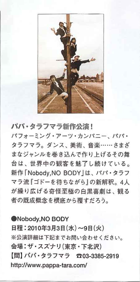 「Nobody,NO BODY」Press release[English.ver] (Google docs Viewer)パパ・タラフマラでは、この作品を一人でも多くの方に、楽しみ、味わっていただきたいという